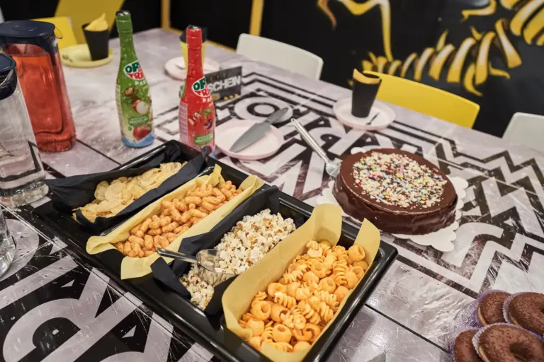 Snacks wie Süßspeisen, Obst, Chips oder Brötchen dürfen gegen eine kleine Servicepauschale mitgebracht werden. Stark riechende Speisen (z. B. Burger, Pizza, McDonald’s) sind nicht erlaubt.