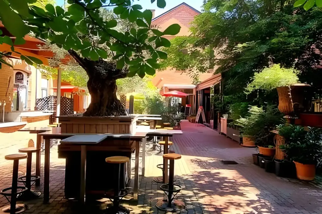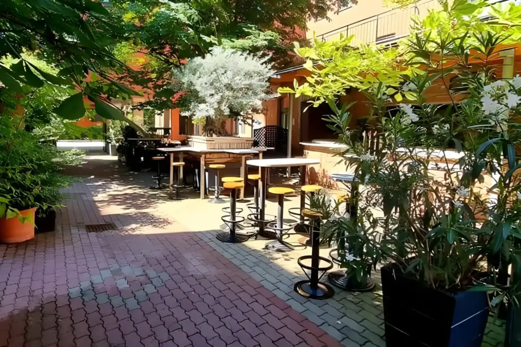 Durch die Aufteilung mehrerer Sitzgelegenheiten eignet sich der Gastgarten auch für eine kleinere Gruppe. Für ein ungestörtes Feiern steht euch zudem eine Außenbar zur Verfügung. Viel Grün verleiht dem Hof eine einladende Wohlfühlatmosphäre. Die flexiblen Tische lassen sich individuell arrangieren und können für festliche Tafeln zusammengestellt werden.