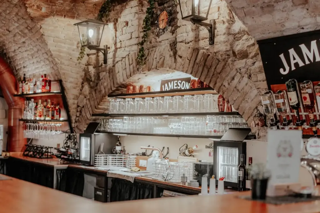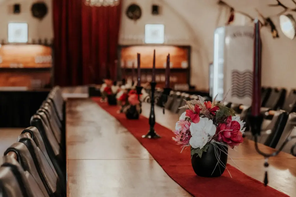 Der Rittersaal trumpft mit einer langen, ritterlichen Tafel, an der bis zu 30 Gäste Platz nehmen können, separaten Tischen sowie einer großen Bar mit Selbstbedienung. Insgesamt bietet der Raum Platz für bis zu 42 Gäste. Die Wände sind mit Details, wie Geweihen und klassischen Ritteraccessoires dekoriert, um dem Raum das richtige Flair zu verleihen. Hier fühlt man sich wirklich wie im Mittelalter und bekommt Lust auf ein gutes Bier in geselliger Runde.