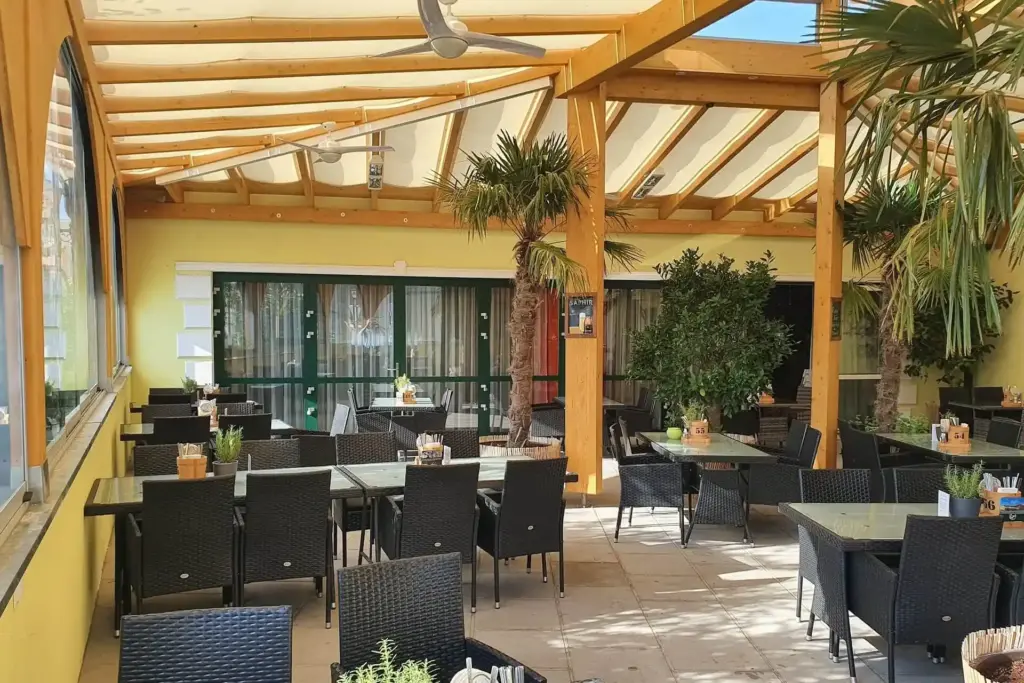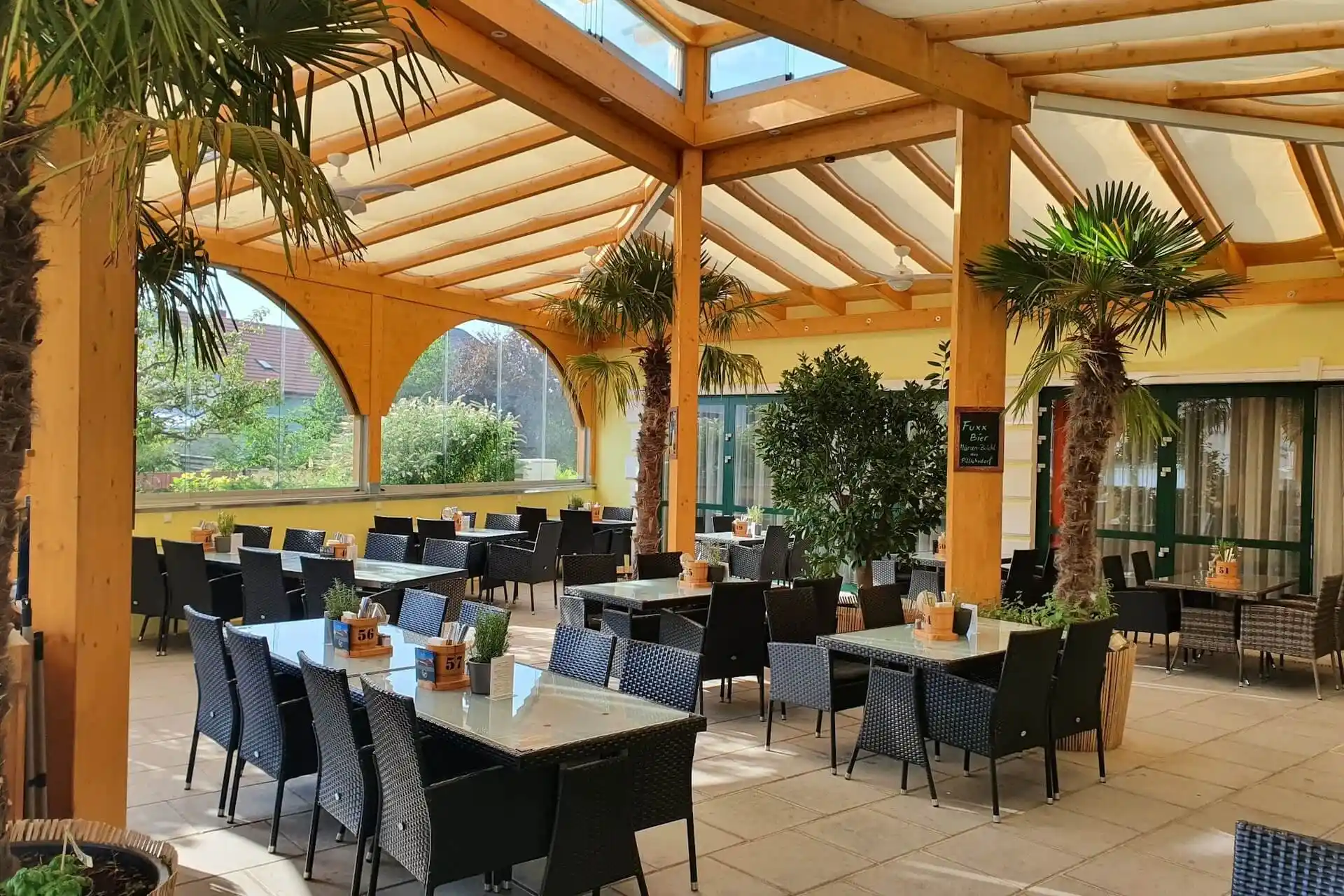Der großzügige und helle Wintergarten bietet ein ganz besonderes Ambiente zu jeder Jahreszeit für bis zu 100 Gäste. Mit seinem schönen Dach aus Holzbalken, den imposanten Palmen und großen arkadenartigen Fenstern strahlt er ein mediterranes Flair aus, in dem man sich sofort wohlfühlt.