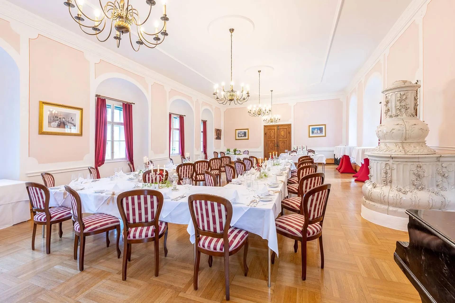 Im Festsaal, dem größten der Räume, können bis zu 80 Personen Platz nehmen. Dieser schöne Saal mit Echtholzparkett und einem königlich historischen Ofen bietet einen herrlichen Blick auf den Schlosspark. Bei höherer Gästeanzahl kann der Saal mit der Galerie zusammen gemietet werden und bietet somit Platz für 100 Gäste.