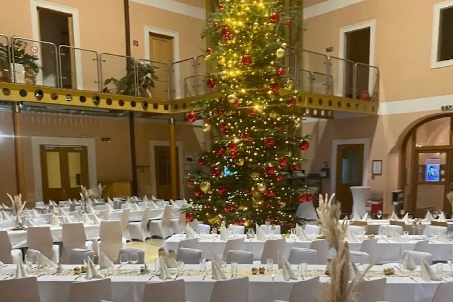 Ein festlich geschmückter Raum mit hoher Decke, Galerien und viel Licht, ideal für Weihnachtsfeiern, Galadinner oder andere festliche Anlässe mit bis zu 150 Personen.