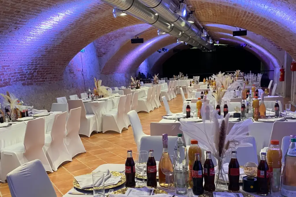 Modernes Lichtkonzept trifft auf altes Gemäuer, das imposante Kaltargewölbe bietet Platz für bis zu 120 Gäste und eignet sich besonders für größere Feiern mit Tanzfläche oder Bühnenprogramm.