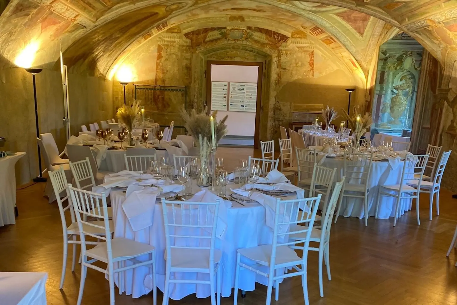 Dieser Raum ist ein echter Blickfang: Historische Wandmalereien, elegante Beleuchtung und eine intime Atmosphäre machen den Freskasaal zu einer ganz besonderen Kulisse für deine Feier mit bis zu 80 Gästen.
