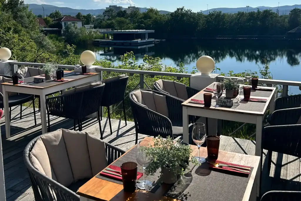 Genieße an schönen Tagen dein Event mit bis zu 80 Gästen auf der großzügigen Terrasse, welche sich auf 2 Ebenen erstreckt. Feier das Event mit deinen Gästen auf der großen Terrasse mit herrlichem Ausblick. Elegantes Interieur aus gemütlichen Holzmöbeln laden zum Verweilen ein und große Sonnenschirme schützen vor zu viel Sonne.