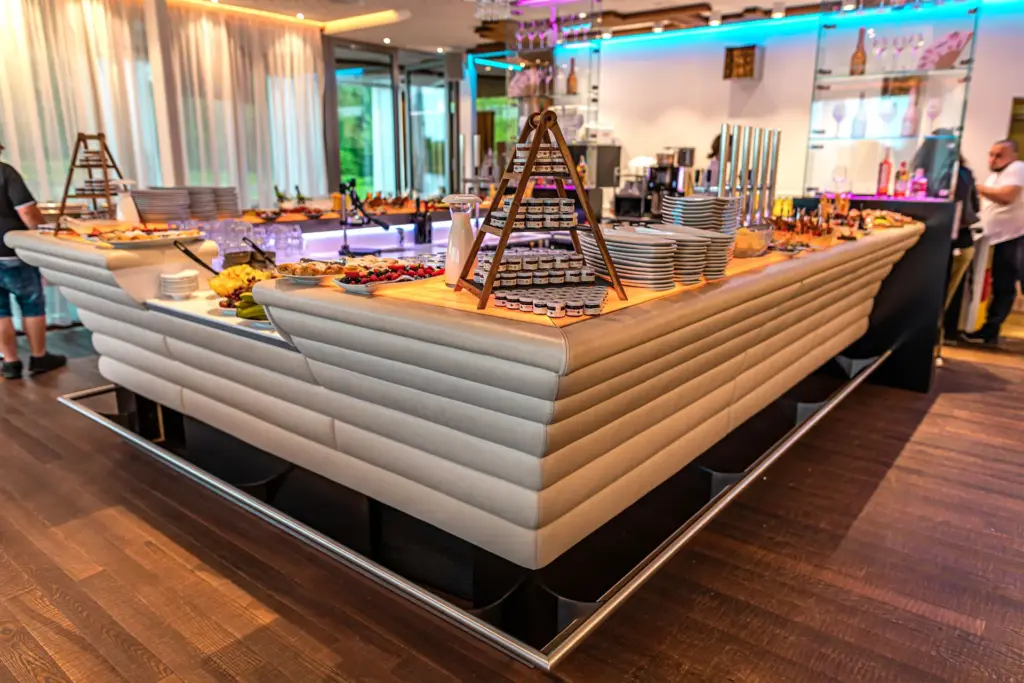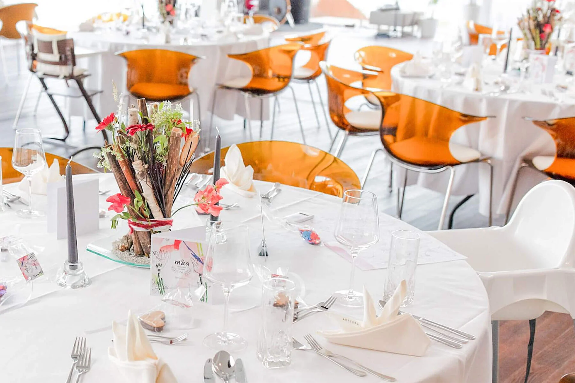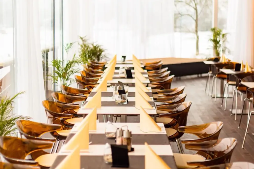 Das Mobiliar ist flexibel, was eine freie Tischeinteilung ermöglicht, die sich ganz deinen Wünschen und Bedürfnissen anpasst. So können große/kleine Tafeln angeordnet werden oder eine lockere Aufteilung.