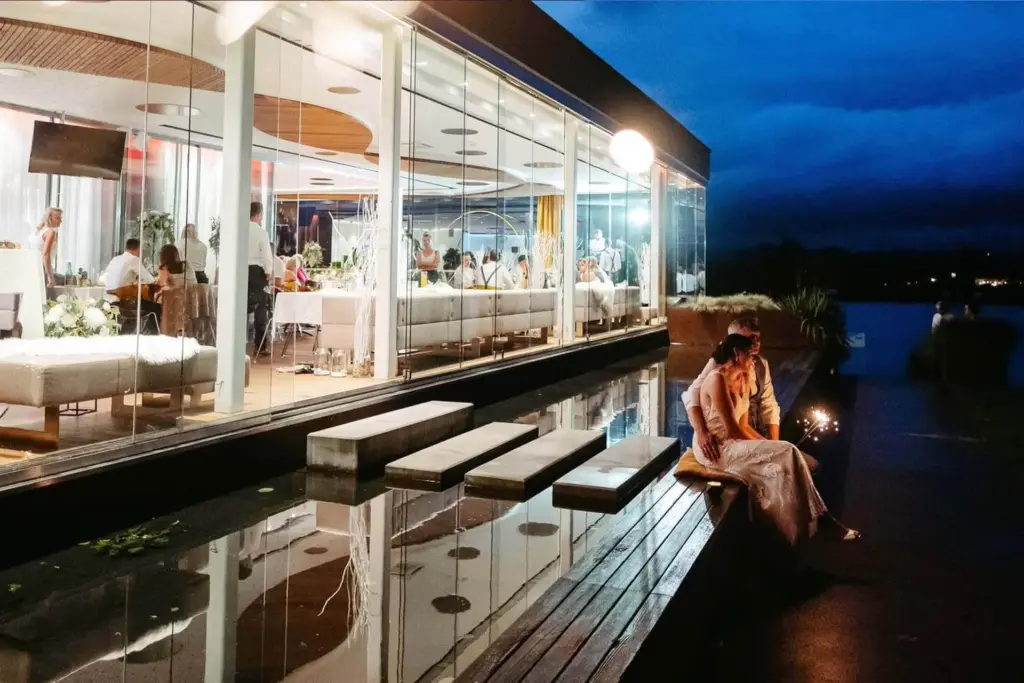 Im DAS SEE kann sowohl Indoor als auch Outdoor das ganze Jahr über gefeiert werden. Die Location hat eine große Glasfront, die zum einen herrlichen Blick auf den See und die Jetlake Anlage bieten. Zum anderen lassen sich die einzelnen Elemente verschieben und somit öffnen. Dadurch hat man einen direkten Zugang zu der Außenanlage und Terrasse.