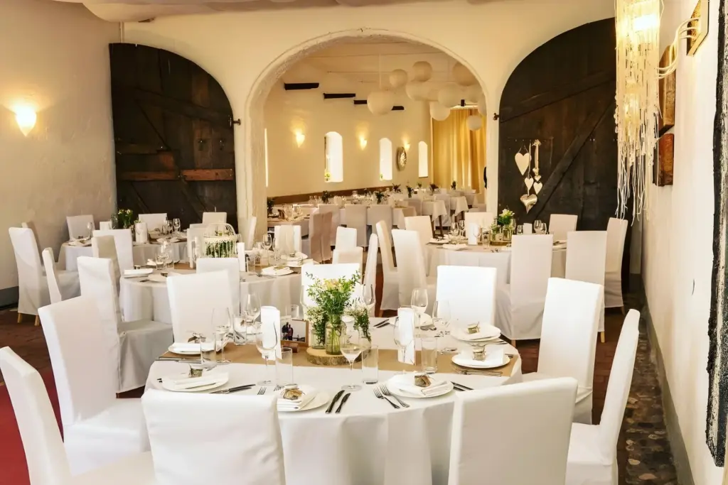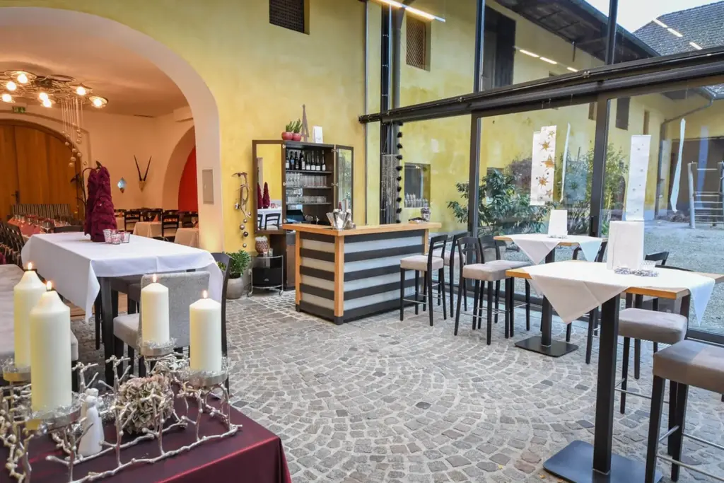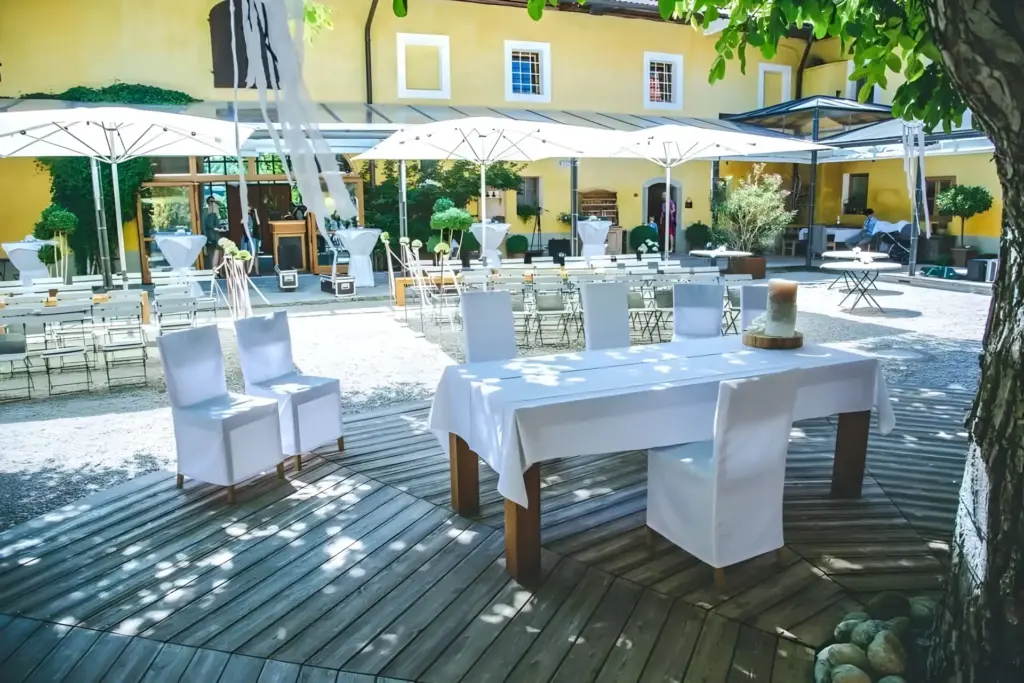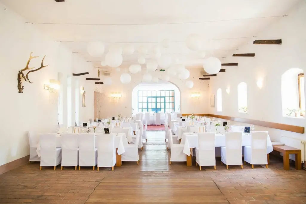 „Für eine mittelgroße Hochzeit ideal. Man merkt noch, dass es früher ein Wirtschaftsgebäude war, aber genau das macht den Charme aus. Man ist für alles gewappnet: Teilweise Überdachung des Innenhofbereichs, Nebensaal und Räumlichkeit für Catering. Die Bedienung ist nett und zuvorkommend.“
