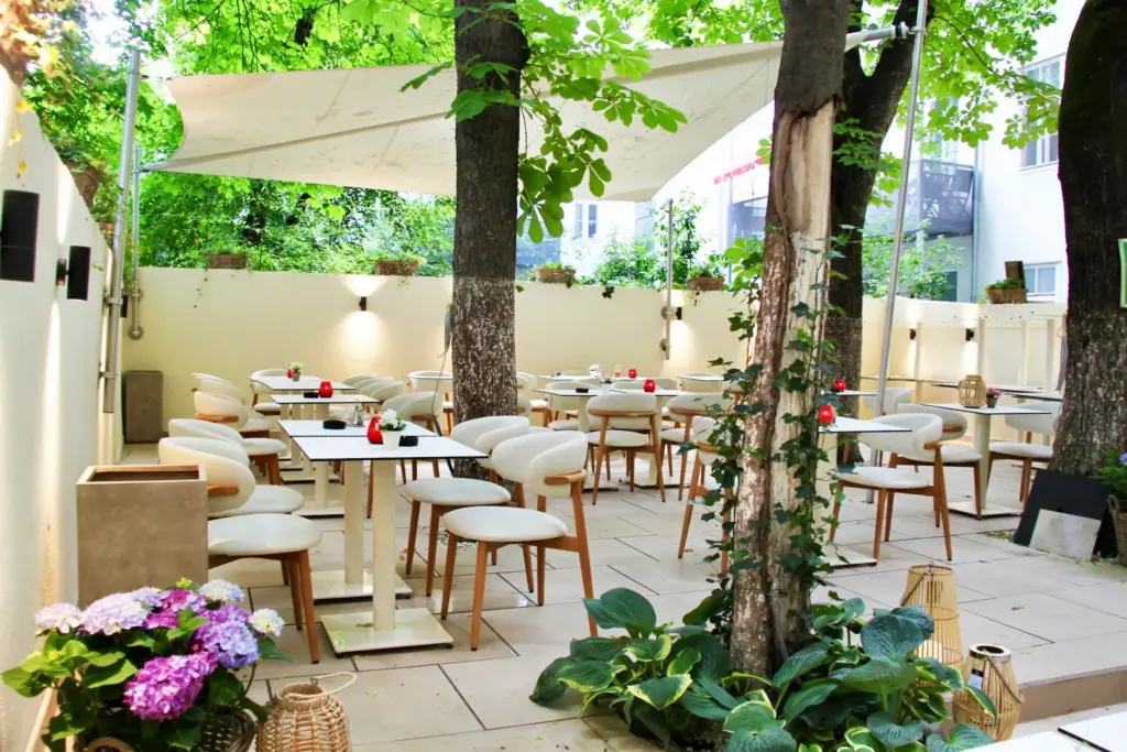 Ein schattiger Hinterhofgarten für entspannte Veranstaltungen im Freien. Bitte beachten: Musik & Events im Garten sind bis 22 Uhr erlaubt.