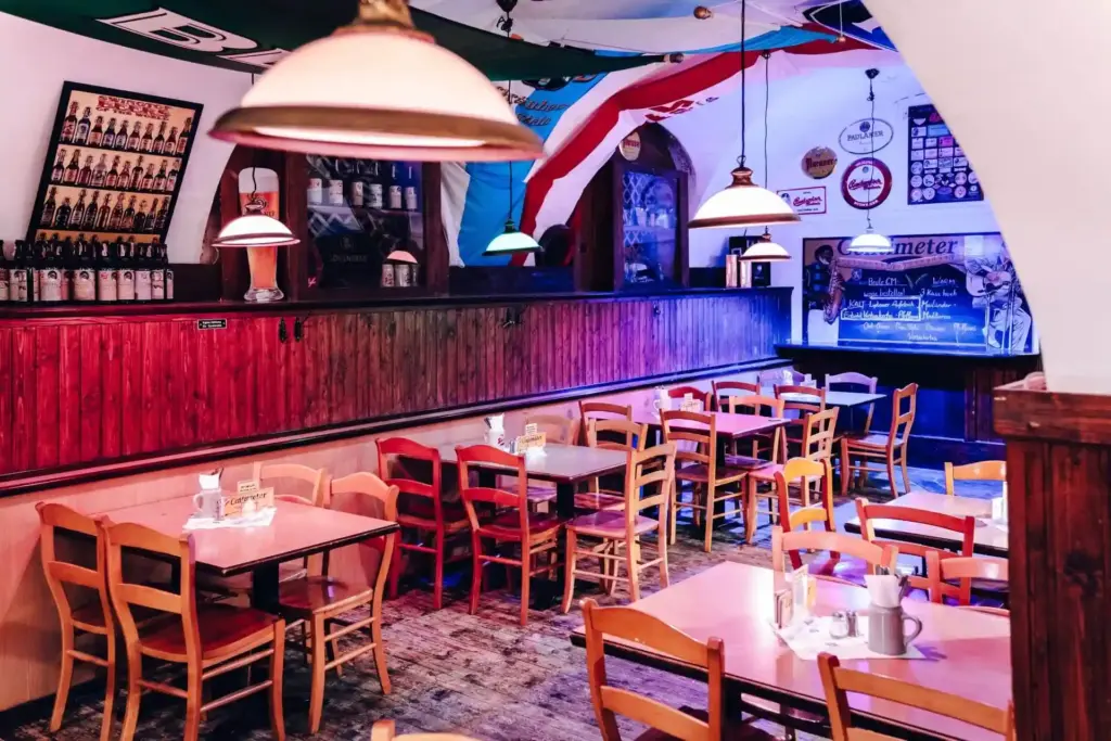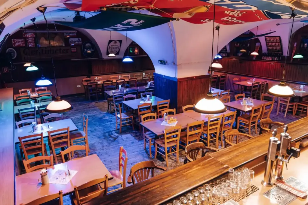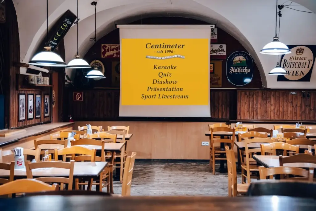 Mit einer Auswahl aus acht verschiedenen Biersorten vom Fass, einschließlich des bekannten Centimeter Hausbiers, sowie zahlreichen Gerichten aus österreichischer Hausmannskost kommt hier jeder, der es deftig mag, voll auf seine Kosten.