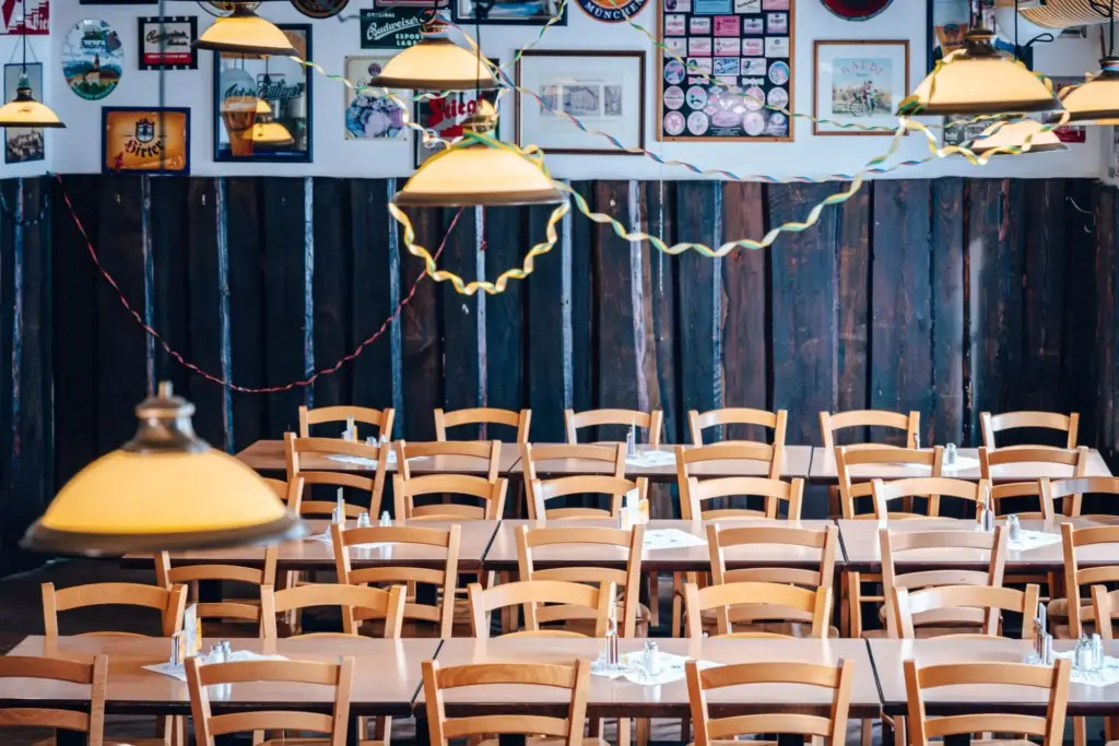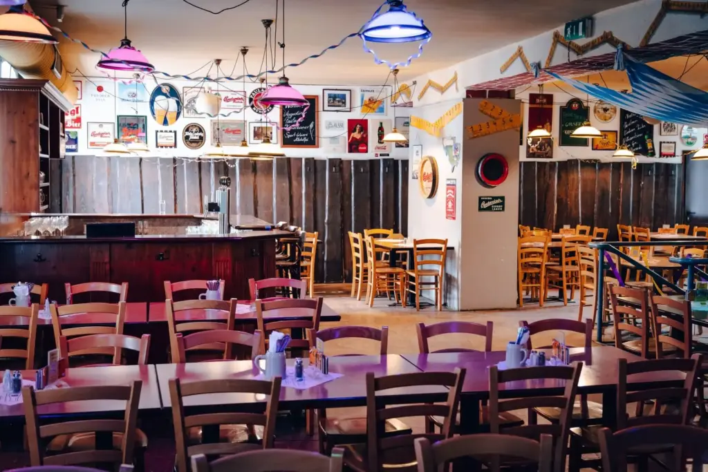 Es hat ein gediegenes Ambiente und ein Interieur aus rustikalem Holz, in dem Gemütlichkeit im Vordergrund steht. Viele kleine Details wie die Zentimetermaße, Flaggen und unzähligen Schilder an den Wänden verleihen der Location ihren ganz eigenen und unverwechselbaren Charakter. Die perfekte Location für eine ausgelassene und entspannte Feier!