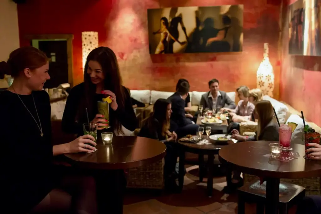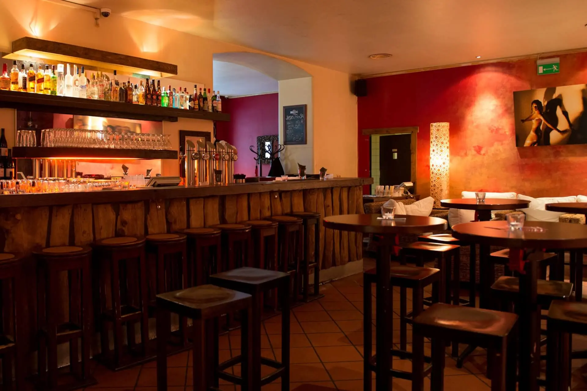 Die dunkelroten Wände in Kombination mit den gemütlichen Korbsesseln und vielen Lichtdekorationen verleihen der Location ein südliches Flair und gibt einem das Gefühl von afrikanischer Leichtigkeit und asiatischer Entspannung – rundum ein schönes Konzept, in dem man sich sofort wohlfühlt.