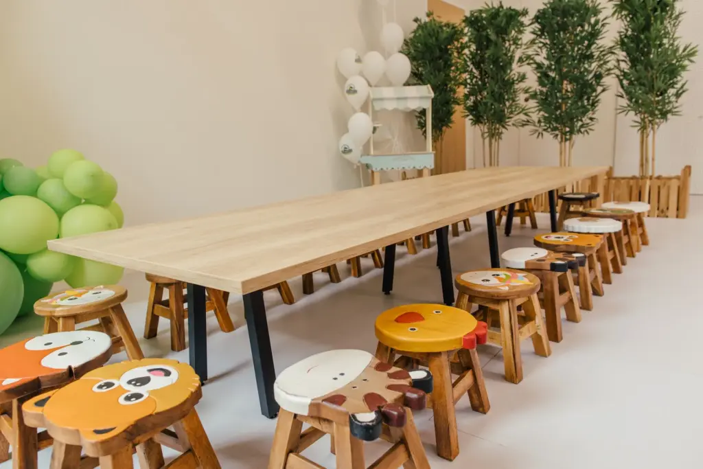 Die Partygang kann an einem großen Tisch gemeinsam zum Torte essen Platz nehmen. 20 Kinder haben immer Platz, auf Wunsch können noch weitere Sitzmöglichkeiten ergänzt werden.
