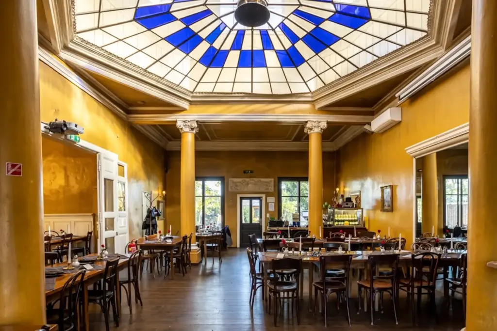 Kuppelsaalbereich: Der prunkvolle Hauptraum mit imposanter Glaskuppel, historischen Säulen und edlem Holzboden bietet ein einzigartiges Flair für stilvolle Feiern. Er verfügt über einen separaten Gartenbereich, der exklusiv für Events genutzt werden kann – perfekt für Agapen oder Trauungen im Grünen.
