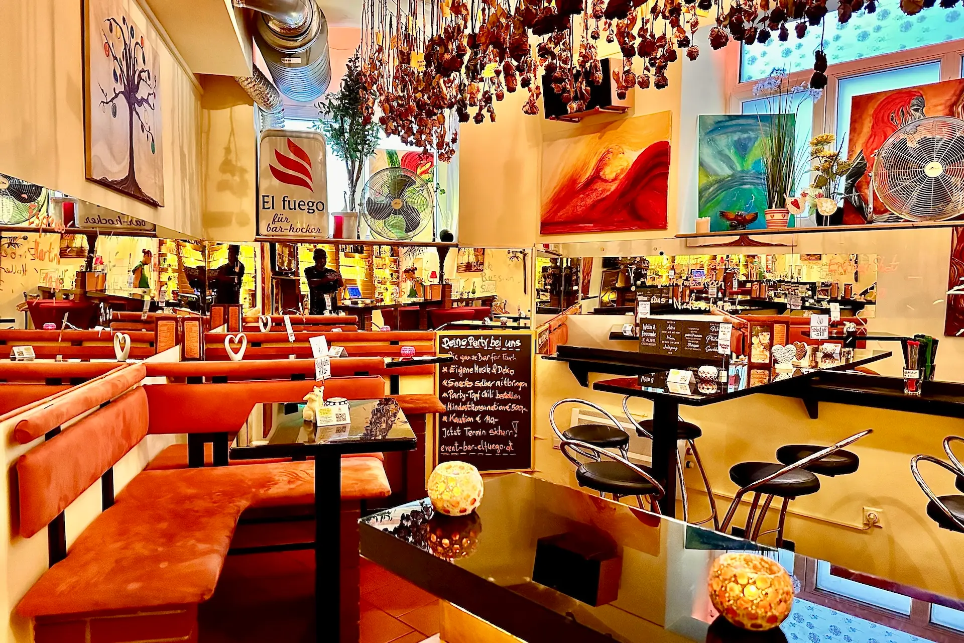 Das El fuego ist eine gemütliche, komplett ausgestattete Bar für deine individuelle Feier – jeden Tag der Woche für dein Event mietbar. Mit mind. 25 bis 35 Gästen kannst du hier ausgelassen deine Feste feiern. Es gibt keine Miete für die Location. Dafür eine Mindest-Getränke-Konsumation 500 EUR + einer Reinigungspauschale von 40 EUR. Bei der Reservierung wird um eine Kaution von 140 EUR gebeten.