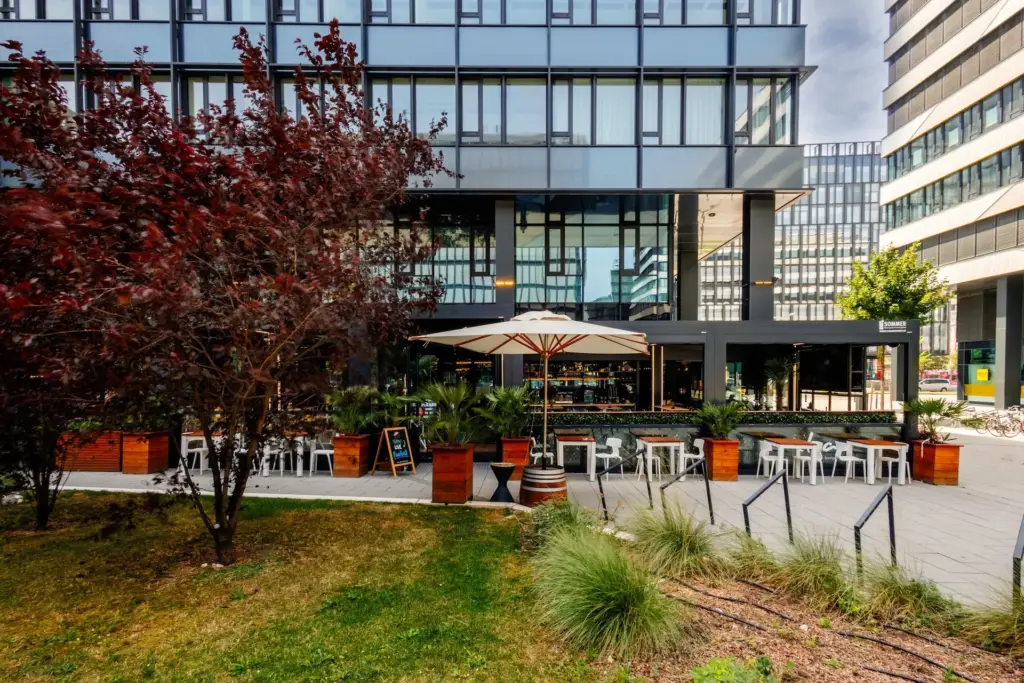 Mitten im Grünen und doch urban – diese Terrasse bietet lockere Atmosphäre mit Blick auf das moderne Büroviertel. Perfekt für Empfänge oder entspannte Outdoor-Dinner.