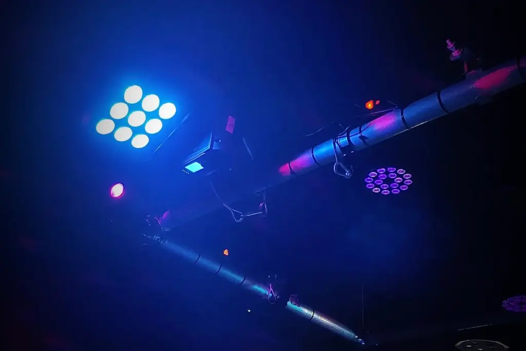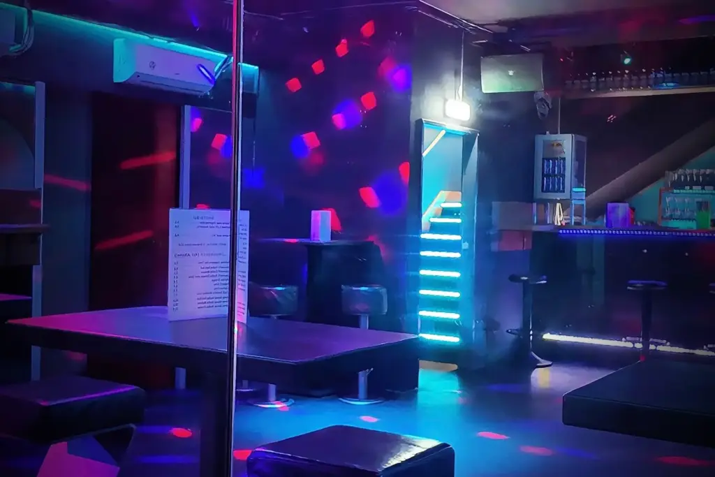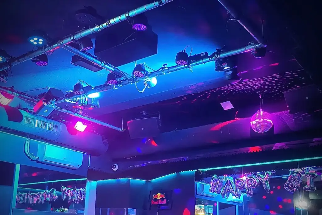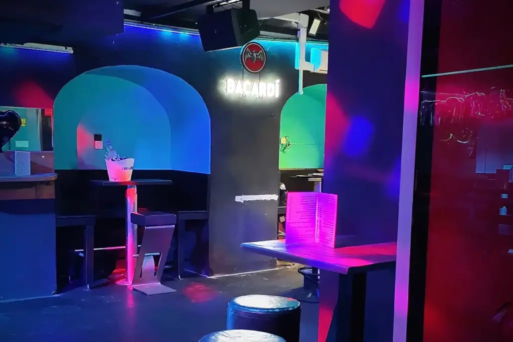mit Bar, DJ‑Pult, Tanzfläche
