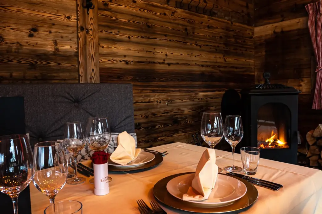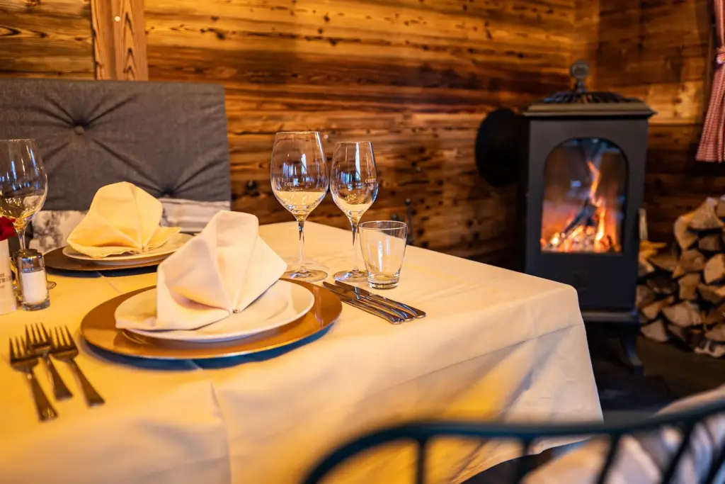 Die wohlige Wärme des Ofens durchdringt den Raum, während die großen Fensterfronten einen romantischen Blick auf den Fluss und die Terrasse bieten. Die natürliche Schönheit draußen verleiht jeder Feier eine besondere Note.