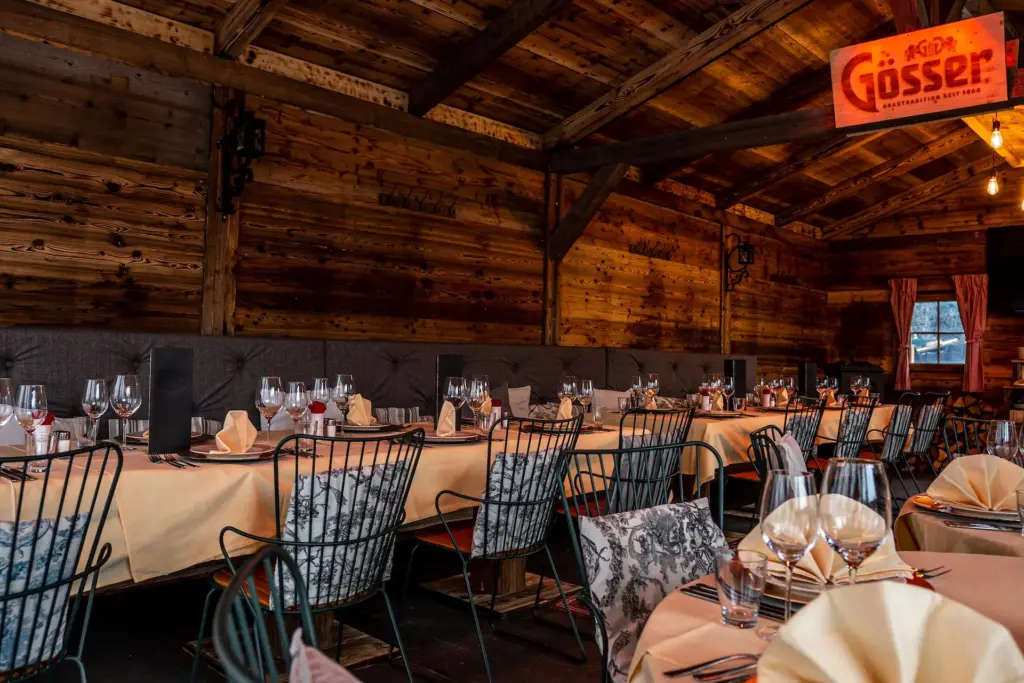 Wer den ländlichen Charme liebt und sich in der rustikalen Gemütlichkeit wohlfühlt, wird von der Gösserstube mehr als begeistert sein. Denn hier paart sich Hüttenpracht mit modern lockerer Eleganz in Form von stilvollen Möbeln. Mit bis zu 35 Gästen könnt hier das ganze Jahr über Feste feiern, Wissen austauschen oder einfach gemütlich beieinander sitzen und eine tolle Zeit haben. Die vielen Fenster erhellen die Stube angenehm und bieten einen wunderschönen Ausblick auf das Wiener Erholungsgebiet.