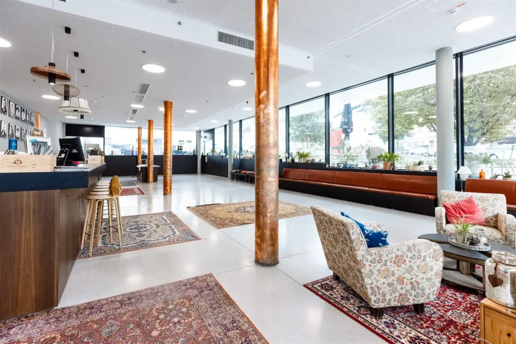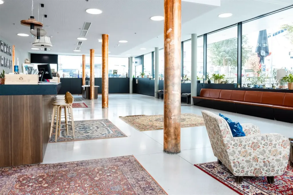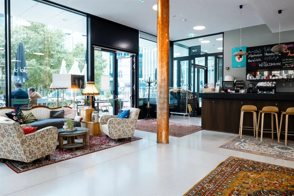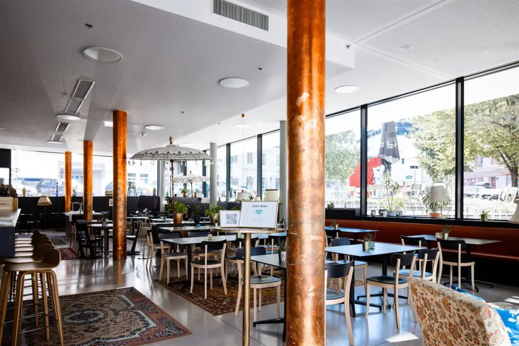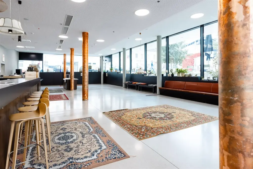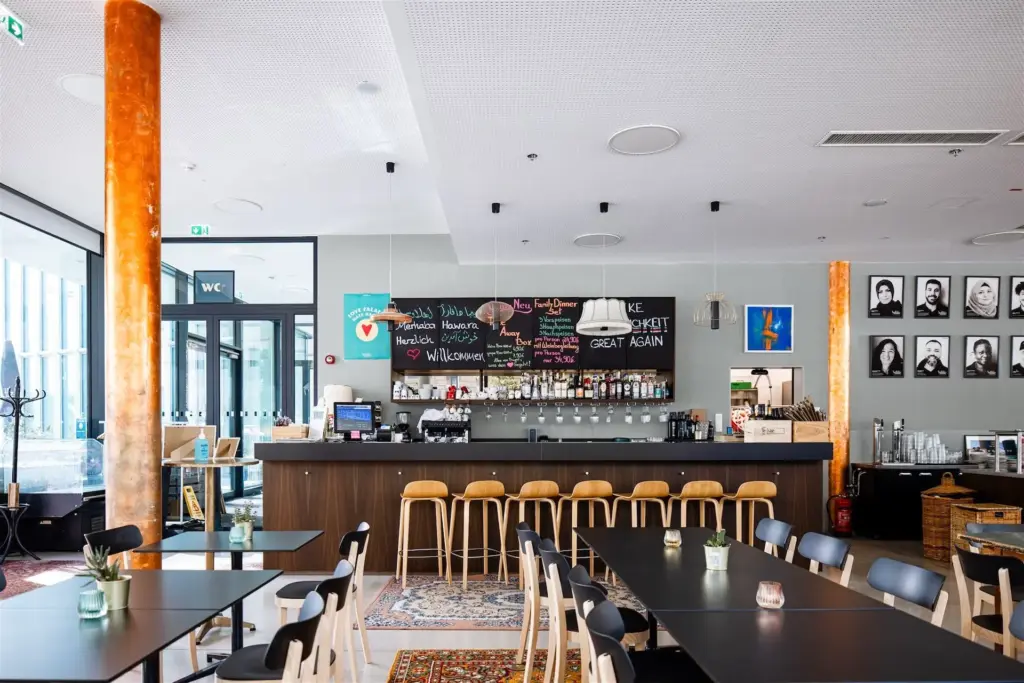 Die großzügige Eventfläche von Habibi & Hawara lässt sich flexibel an verschiedene Veranstaltungsformate anpassen. Die moderne Raumgestaltung kombiniert warme Materialien mit einem offenen, einladenden Ambiente und schafft damit den idealen Rahmen für stilvolle Events.