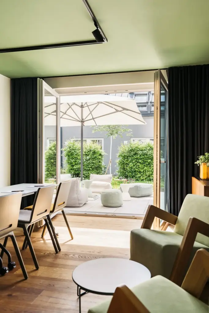 Ein stilvoller Raum mit viel Tageslicht, eigener Terrasse und professionellem Equipment, ideal für Meetings, Workshops oder hybride Formate. Durch die ruhige Atmosphäre ist er ein echter Rückzugsort für konzentriertes Arbeiten oder persönliche Gespräche für bis zu 40 Personen.