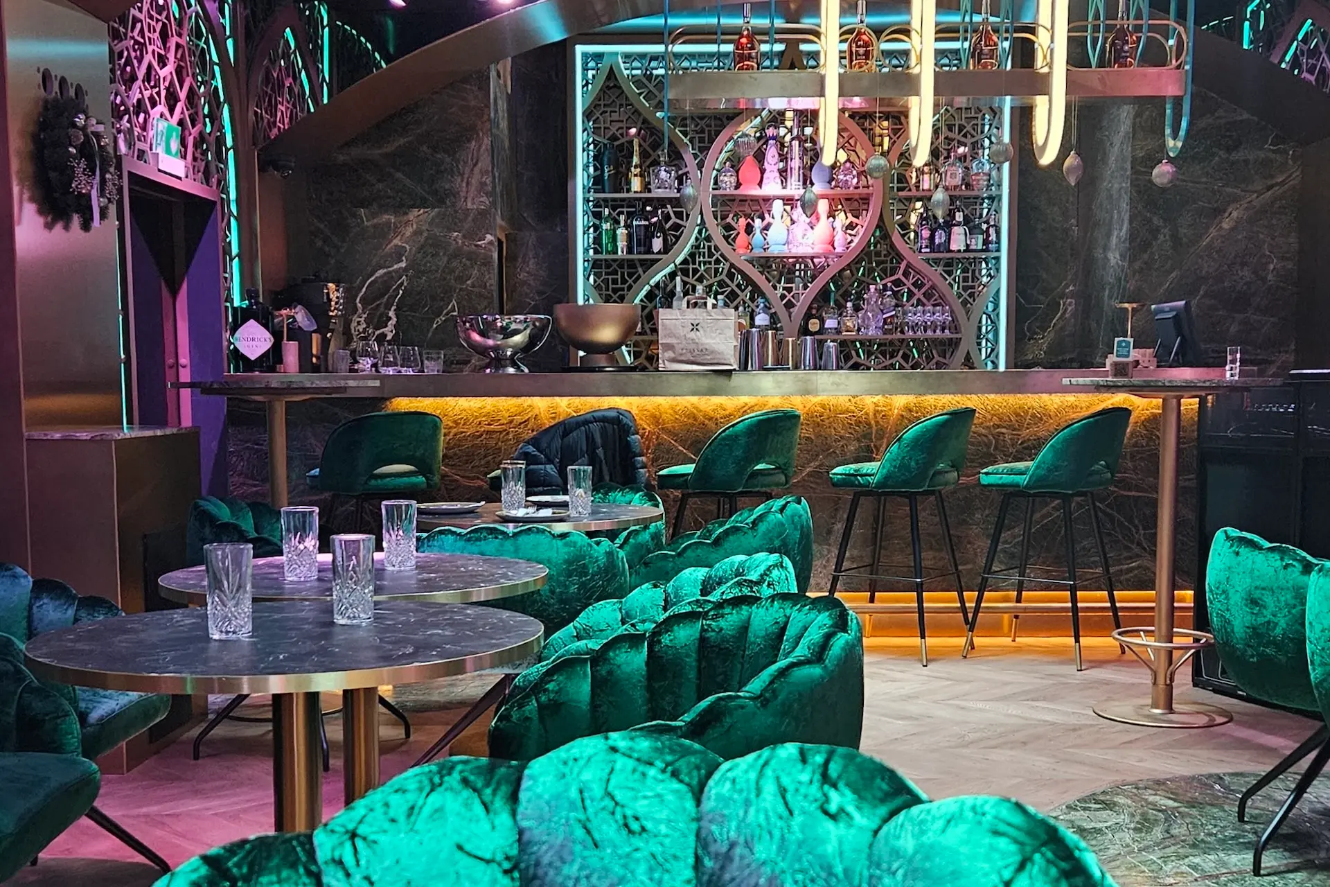 Das moderne Clubdesign schafft eine stilvolle Atmosphäre für Feiern, Präsentationen oder Live-Events. Die Fläche lässt sich flexibel gestalten, je nachdem, ob ein gesetztes Dinner, ein Networking-Event oder eine ausgelassene Party geplant ist.