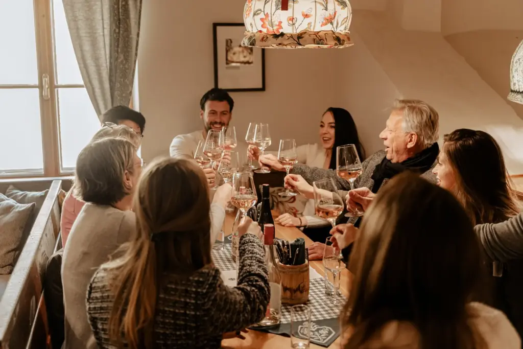 Zur Begrüßung wird im Garten ein eigener Aperitif-Bereich vorbereitet, mit Stehtischen, Bowle, Winzersekt und kleinen Häppchen wie belegten Schmankerlhappen oder hausgemachten Aufstrichen. Im Winter sorgt die Punschhütte mit Glühwein, Punsch und ofenfrischen Maroni für festliche Stimmung.