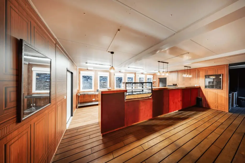 Die geräumige Bar ist technisch auf dem neuesten Stand und mit modernster Kühl- und Ausschanktechnik ausgestattet. Sie ist so gestaltet, dass lange Wartezeiten vermieden werden, und schließt direkt an das Foyer an.
