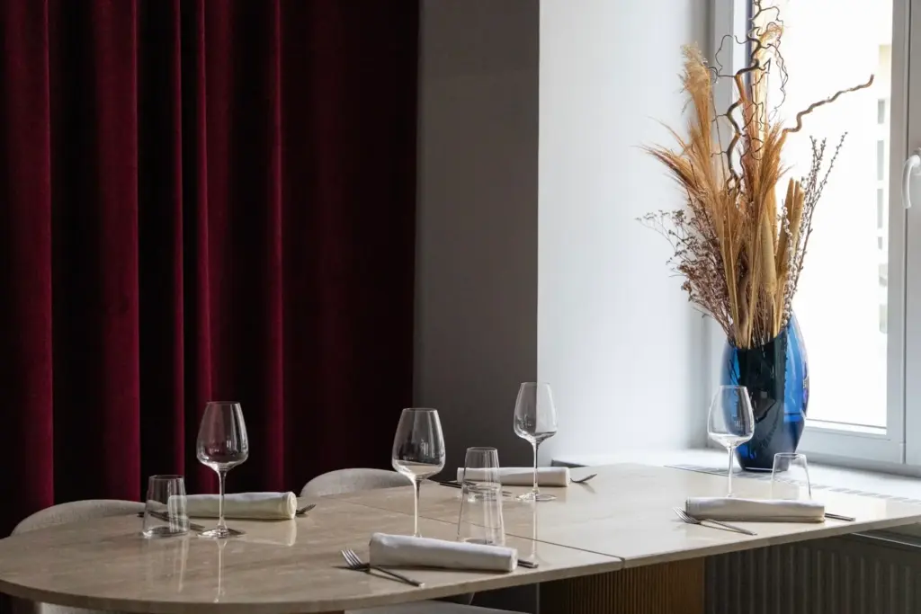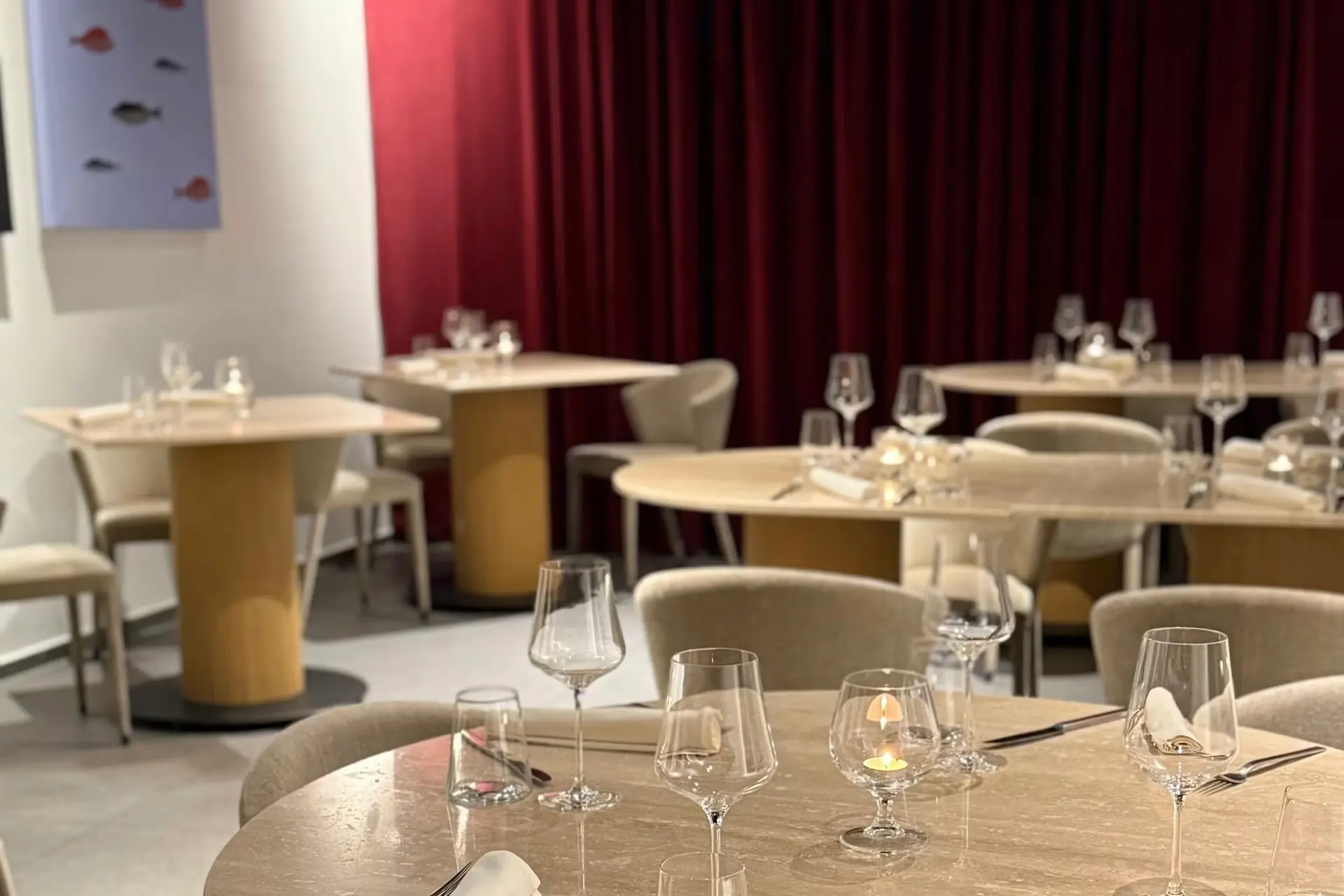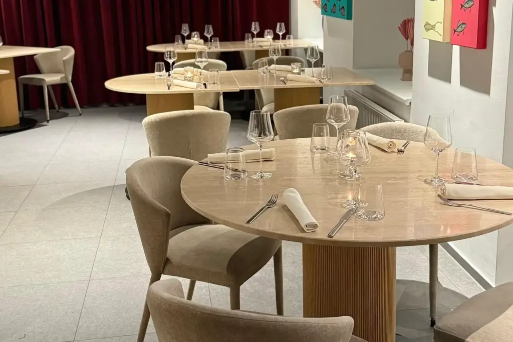 Der elegante Innenbereich mit hochwertigen Marmortischen bietet Platz für rund 50 Gäste und eignet sich ideal für gesetzte Dinner, Firmenfeiern oder Geburtstage im gehobenen Rahmen. Die Atmosphäre ist intim, stilvoll und gleichzeitig herzlich, perfekt für Events, bei denen Qualität und Ambiente im Vordergrund stehen.