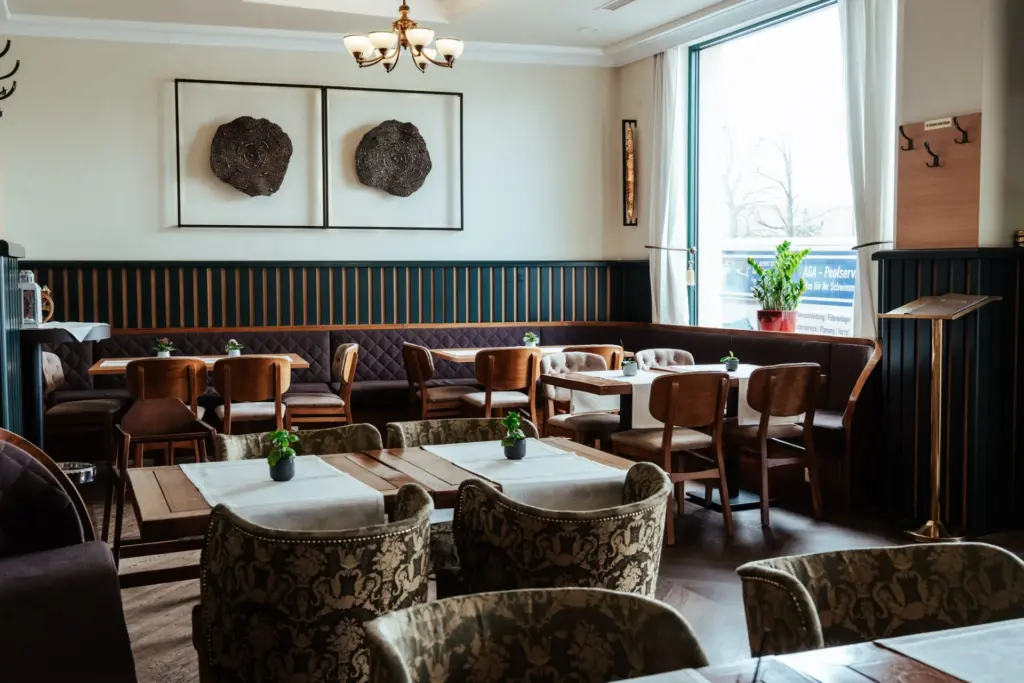 Im Restaurant Tafelspitz bietet ein dicker Vorhang die Möglichkeit, einen separaten Raum zu schaffen, der sich vom Rest des Lokals abgrenzt. Die edle Einrichtung im herrschaftlichen Stil und die gedämpften Töne schaffen eine elegante Atmosphäre.
