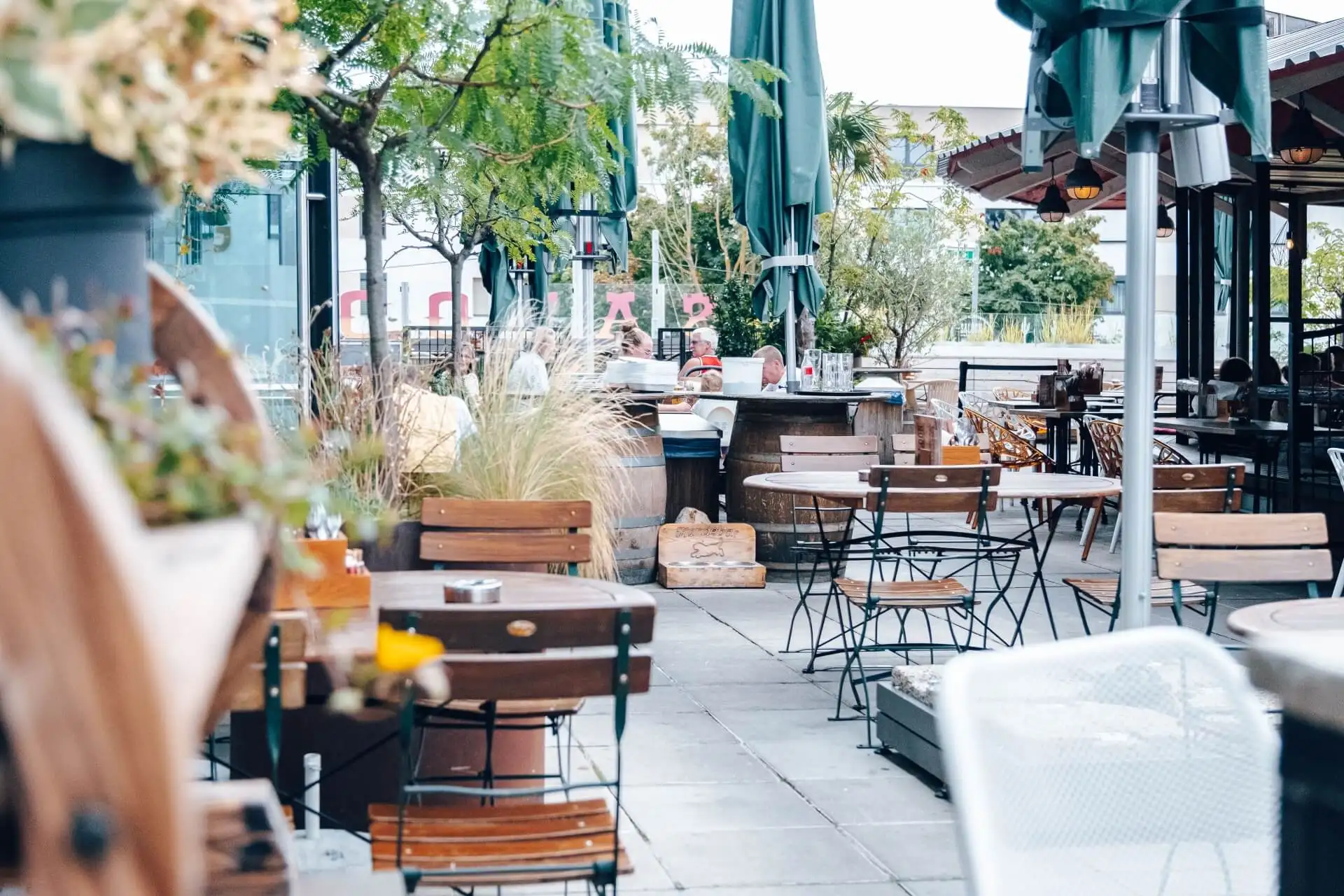 Sie teilt sich auf in einen offenen Bereich mit Sonnenschirmen und einen überdachten Teil. Hier habt ihr Platz für bis zu 250 Personen. Je nach Größe deiner Veranstaltung kann ein Bereich separiert werden oder du mietest die ganze Terrasse.