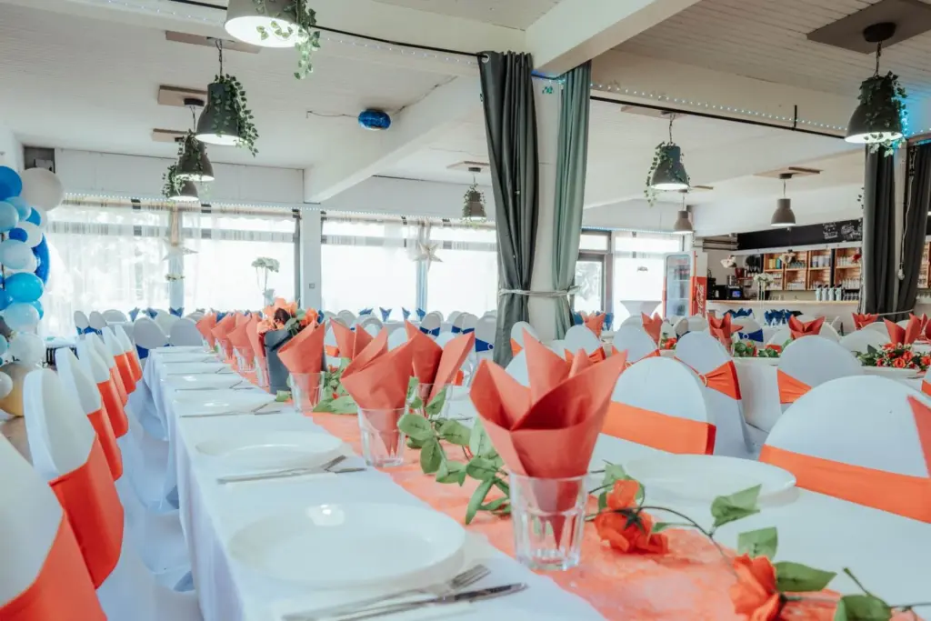 Der Saal im Tenniscafe besticht durch eine gelungene Mischung aus ländlich und modernem Ambiente. Mit Platz für bis zu 120 Gästen bietet er ausreichend Raum für diverse Veranstaltungen. Durch einen Vorhang kann der Saal auch für kleinere Gruppen in eine linke und rechte Seite unterteilt werden, was eine flexible Nutzung ermöglicht. Dabei bietet der 1. Teil Platz für 70 Gäste und der 2. Teil für 50 Gäste. Die Tische lassen sich je nach Bedarf und Wunsch variabel anordnen, um den individuellen Anforderungen verschiedener Veranstaltungen gerecht zu werden. Egal ob formelles Event oder private Feier – der Saal im Tenniscafe bietet eine tolle Kulisse für unvergessliche Momente im schönen Ambiente.