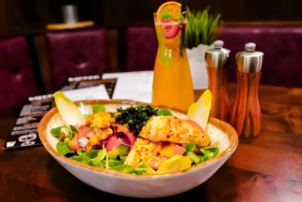 Als Starter findest du auf der Karte beispielsweise frische Suppen, knackige Salate, Flammkuchen, diverse Brote und Beef Tatar sowie BBQ-Karfiol Wings und geflämmten Ziegenkäse.