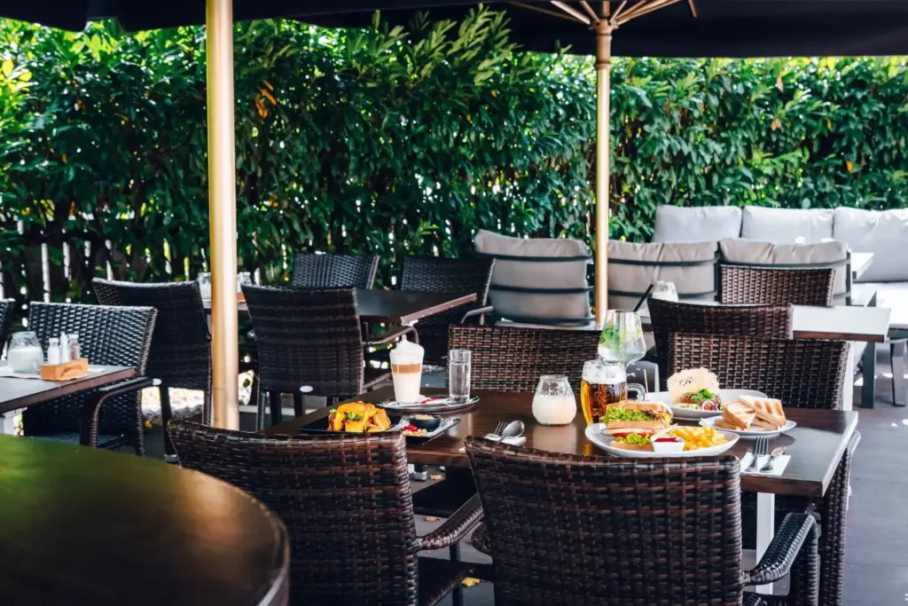 Üppiges Grün sowie Zaunelemente bieten nicht nur angenehmen Sichtschutz, sondern verleihen dem Gastgarten auch das richtige Gartenflair und schaffen ein einladendes Ambiente. Die gemütlichen Möbel unterstreichen den Wohlfühlfaktor. Die schönen und großen Sonnenschirme geben dem Gastgarten Raum und schützen exzellent vor zu viel Sonne.